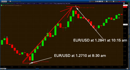 EUR/USD at 1.2710 at 8:30AM and within 1-Hour and 45-minutes price moved up 131-Pips to 1.2841 at 10:15AM.